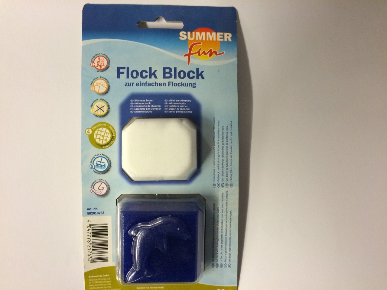 Summer fun Floc blok. Voegt zeer kleine zwevende deeltjes in het water samen tot grotere deeltjes die vervolgens makkelijk door het filter worden opgevangen. Uitsluitend voor zandfilters, in de skimmer plaatsen. Voldoende om zwembaden met een inhoud van 40 – 60 m³ 2 weken kristalhelder te houden. Het is een aanvullend product, naast de reguliere onderhoudsproducten voor het zwembad. Gelblok, inclusief skimmersok.