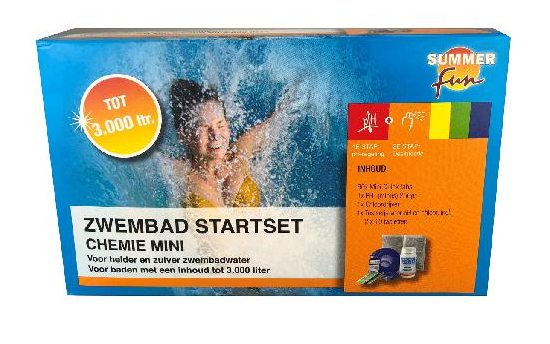Deze startset is perfect voor het opstarten van een klein privé zwembad. De set bevat alle chemie om het bad probleemloos in gebruik te nemen. In de doos zitten: 1 testset voor het meten van de pH-waarde en het chloorgehalte (inclusief 2×10 tabletten), 250 gr pH- (min), 60 tabletten mini quick en een chloordrijver. Deze producten altijd toevoegen aan water en nooit andersom.