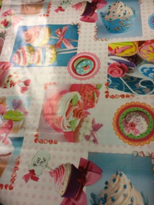 Tafelzeil in Cup cake print. Dit tafelzeil is geschikt voor binnen en buiten, makkelijk afneembaar en waterproof.