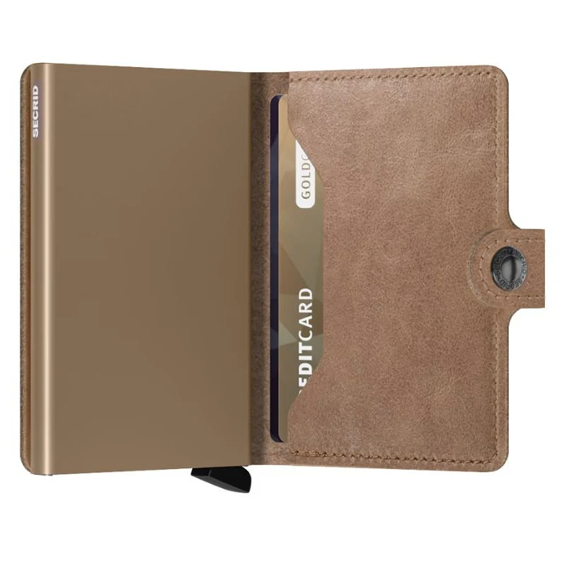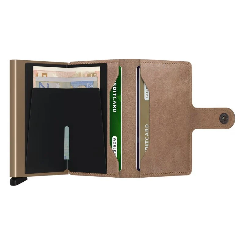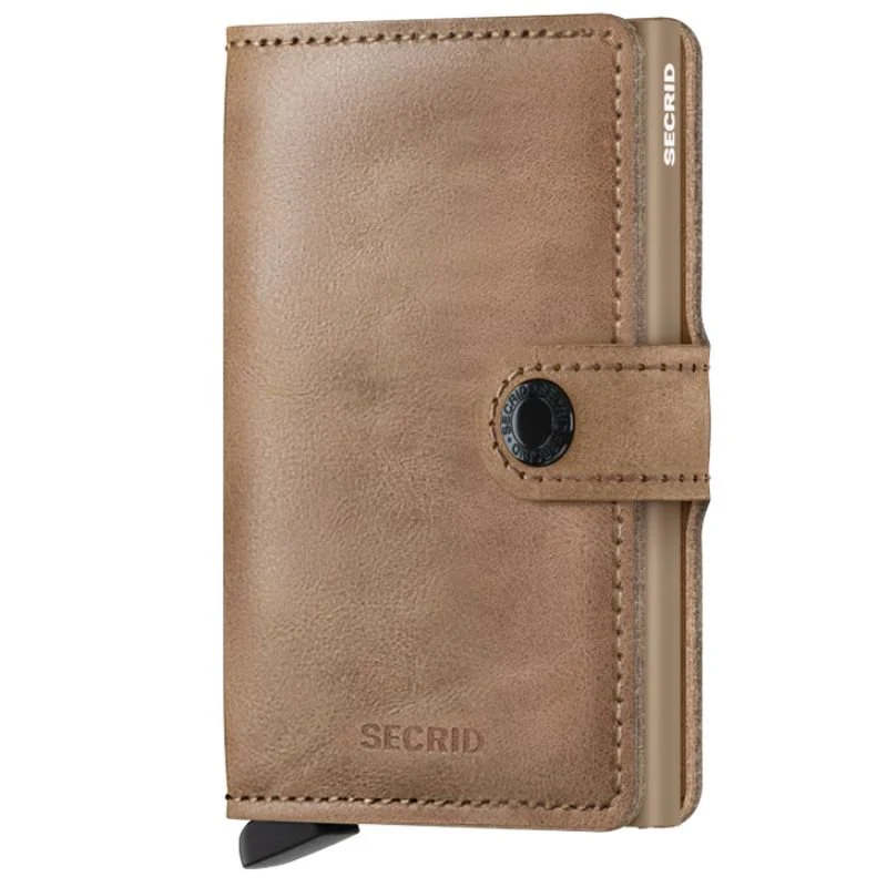 Taupe miniwallet Vintage van Secrid. Deze miniwallet is voorzien van een vintage look in een taupe kleur. In de miniwallet kunnen 4 verdikte of 6 platte kaarten, 4 extra kaarten, bankbiljetten, visitekaartjes en bonnetjes. De Cardprotector maakt het mogelijk om de kaarten met één simpele beweging uit te schuiven en ze te beschermen tegen buigen en breken. De miniwallet is te sluiten via een knoopje en makkelijk mee te nemen.