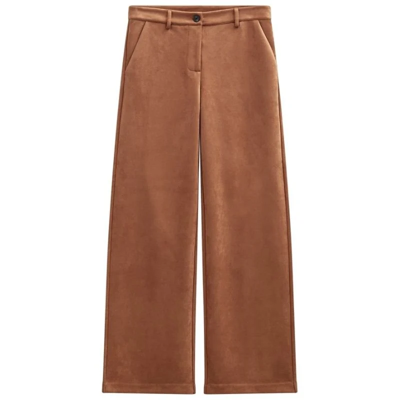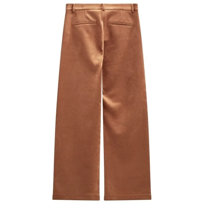Deze fake suede pantalon is veelzijdig te combineren en vormt een mooie set met het bijpassende gilet of jasje. Draag hem met een blouse of fijne knit voor een stijlvolle outfit of combineer met een basic top voor een meer casual uitstraling. Een elegant en comfortabel item dat niet mag ontbreken in de damesgarderobe.