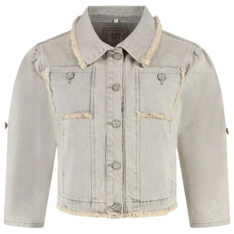 Tiger Grey jacket Zaza van Florez voor dames. Dit korte denim jasje met driekwart mouwen is gemaakt van zacht, comfortabel materiaal en heeft een klassieke kraag en knoopsluiting. De ideale tussenlaag voor frisse dagen of als stijlvol accent op je outfit. De jacket heeft een grijze kleur met ruffles op de naden. Ook verkrijgbaar in het beige.