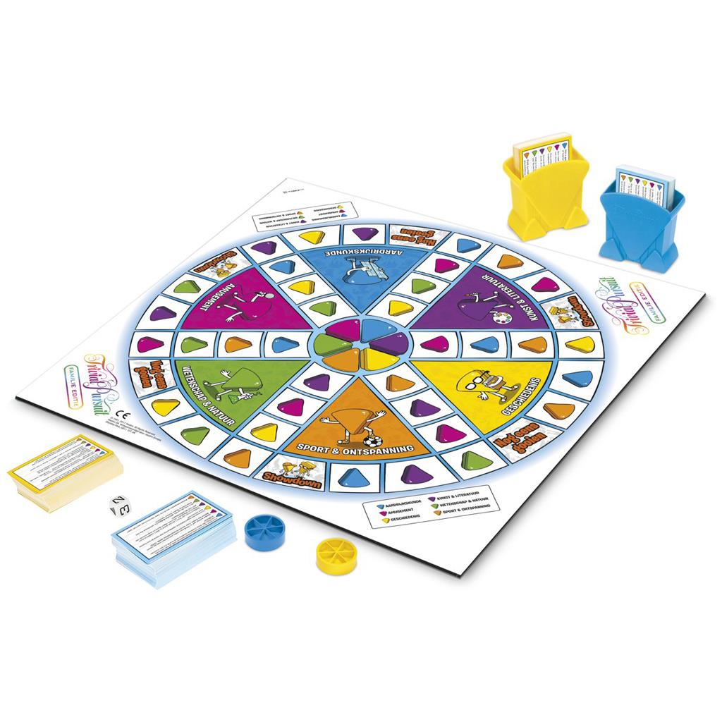 Inhoud: Bord 200 kaartjes met vragen voor kinderen 200 kaartjes met vragen voor volwassenen Zes speelschijven 36 partjes Twee kaartenhouders Dobbelsteen Trivial Pursuit Familie Editie is geschikt voor twee tot zes spelers vanaf acht jaar.
