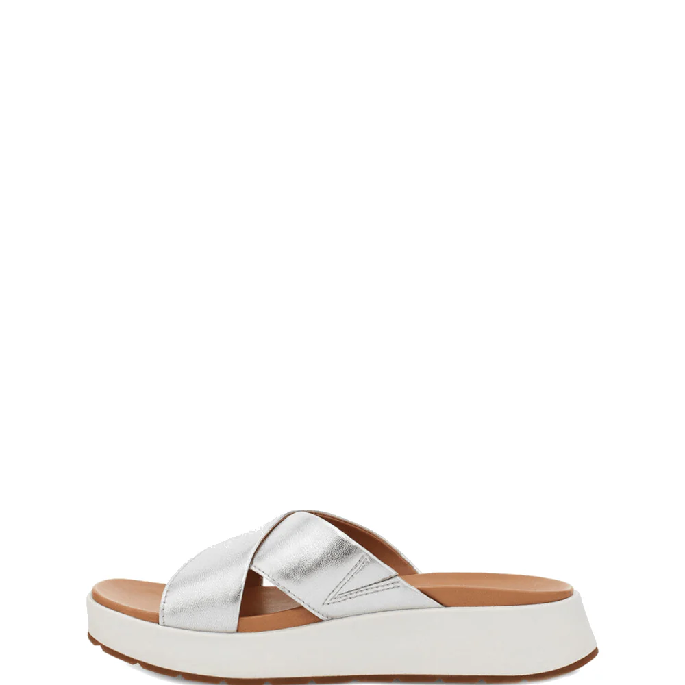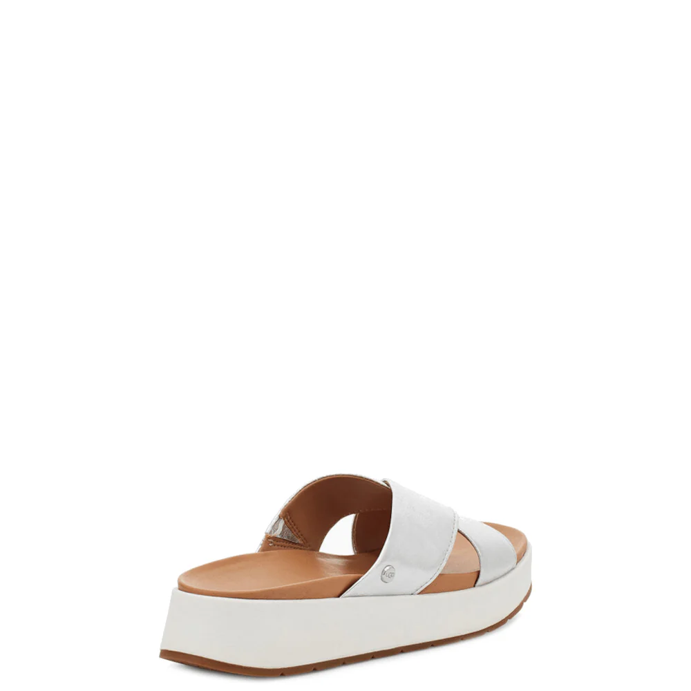 De Ugg Emily slippers, uitgevoerd in een opvallende zilveren kleur, zijn de perfecte aanvulling voor je zomergarderobe. Met gekruiste bandjes van metallic leer en comfortabele elastische inzetstukken bieden deze slippers niet alleen een ongeëvenaard comfort, maar ook een dosis glamour die je voeten verdienen. Het innovatieve Imprint by UGG™-voetbed met drie lagen demping zorgt voor een ongekend comfort, terwijl de duurzame rubberen buitenzool je moeiteloos van het strand naar de stad brengt. Dit veelzijdige model met rechte neus staat goed bij praktisch elke outfit, waardoor het een onmisbaar item in je collectie wordt.