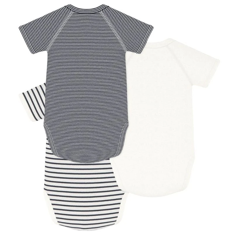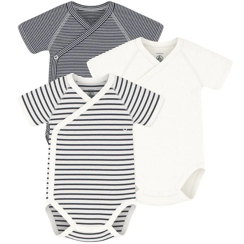 Variant 1 3 BODIES NAISS MC van Petit Bateau voor baby?s. Deze rompertjes zijn voorzien van een overslag en korte mouwen. De rompertjes hebben een witte kleur waarvan twee met een donkerblauw gestreepte print en eentje is effen. Gemaakt van 100% katoen. Deze rompertjes zijn te dragen vanaf net geboren tot 3 maanden. Met gekruiste drukknoopsluiting aan de voorzijde en tussen de beentjes.