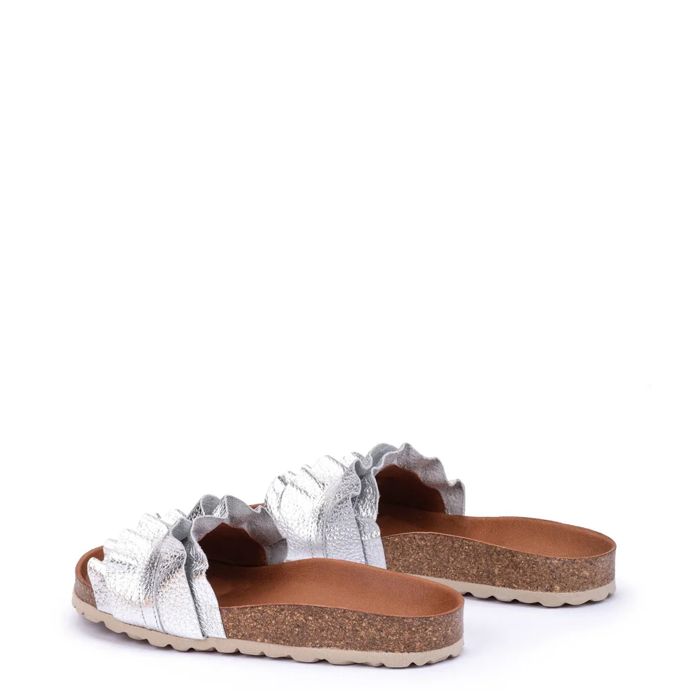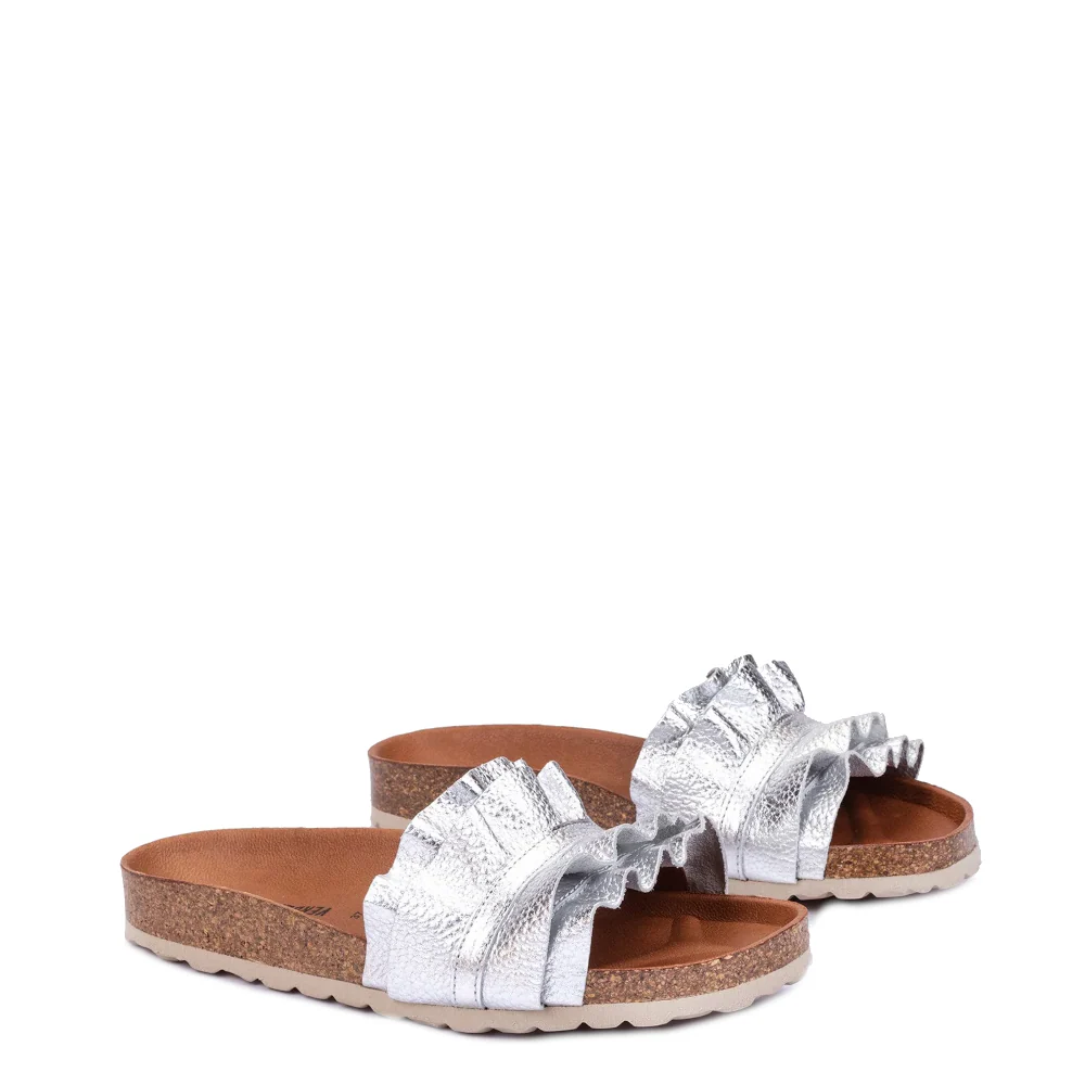 De Verbenas Slippers Rocio Zilver zijn het toonbeeld van elegantie en comfort. Gemaakt van hoogwaardig nappaleer met een opvallende metallic textuur, bieden deze slippers een unieke look die je outfit onmiddellijk opwaardeert. De leren voering en zool zorgen voor een ongekend draagcomfort, terwijl de rubberen en kurken zool duurzaamheid en stabiliteit biedt. Het design met de dubbele ruches voegt een speelse en frisse touch toe, waardoor deze slippers een must-have zijn voor elke fashionista.