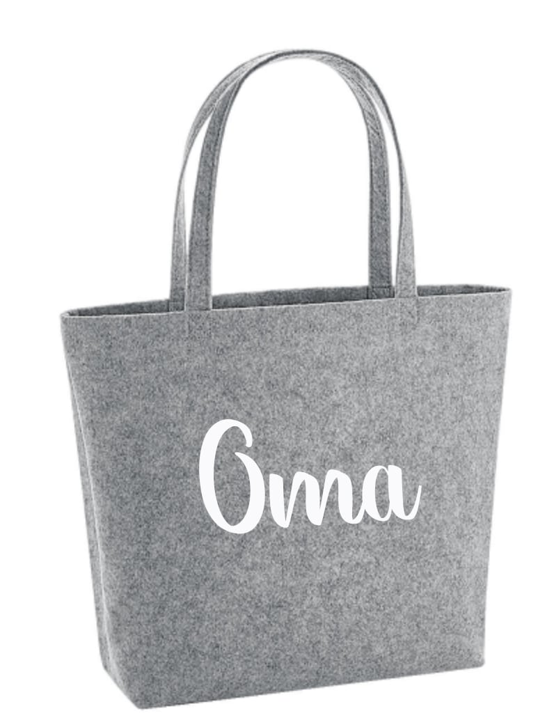 Verras oma met deze gepersonaliseerde vilten tas! De tas bevat een extra opbergvakje aan de binnenkant. De tas is aan één kant bedrukt met oma en plaats de namen van de kinderen of een andere leuke tekst erbij , de opdruk kleur van OMA is standaard wit.