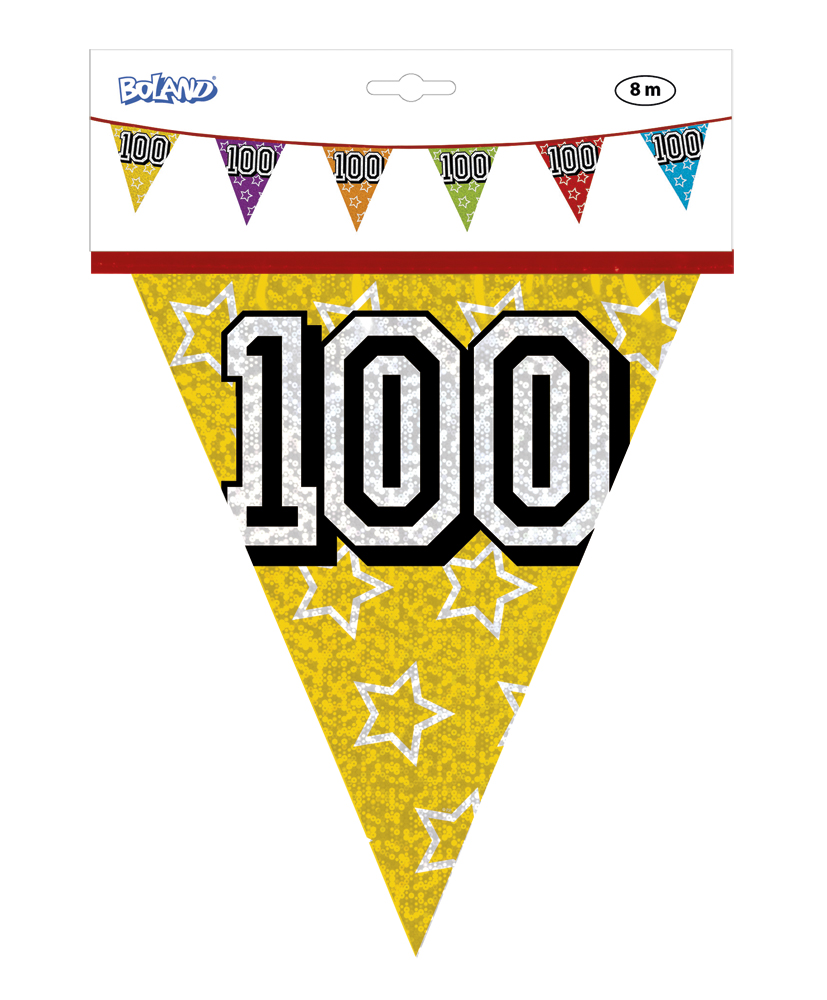 Met deze vrolijk gekleurde exemplaren maak je vanaf de eerste blik duidelijk wie het feestvarken is, want op elk vlaggetje staat het getal 100 .