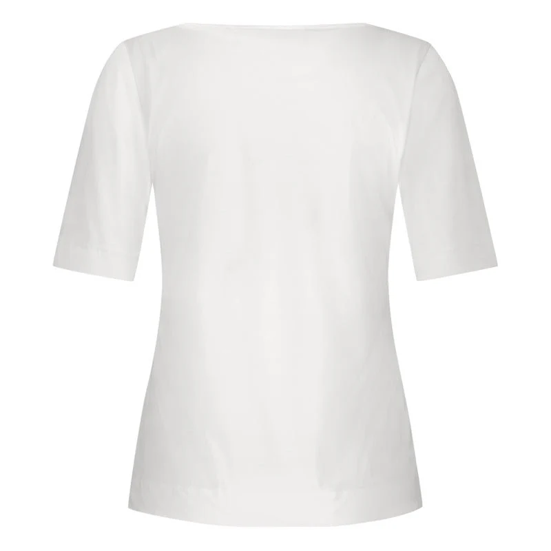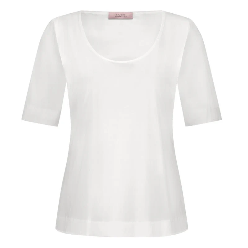 White light travel shirt Sascha van Studio Anneloes voor dames. Dit shirt is een veelzijdige basic met een elegante en tijdloze uitstraling die perfect past binnen elke garderobe. Het item is gemaakt van de lichte en ademende Light Travel Quality die bekendstaat om haar comfortabele stretch en prettige draaggevoel. De regular fit zorgt ervoor dat het shirt soepel langs het lichaam valt zonder strak te zitten. De ronde hals en korte mouwen geven het ontwerp een rustige en verzorgde look die geschikt is voor dagelijks gebruik.