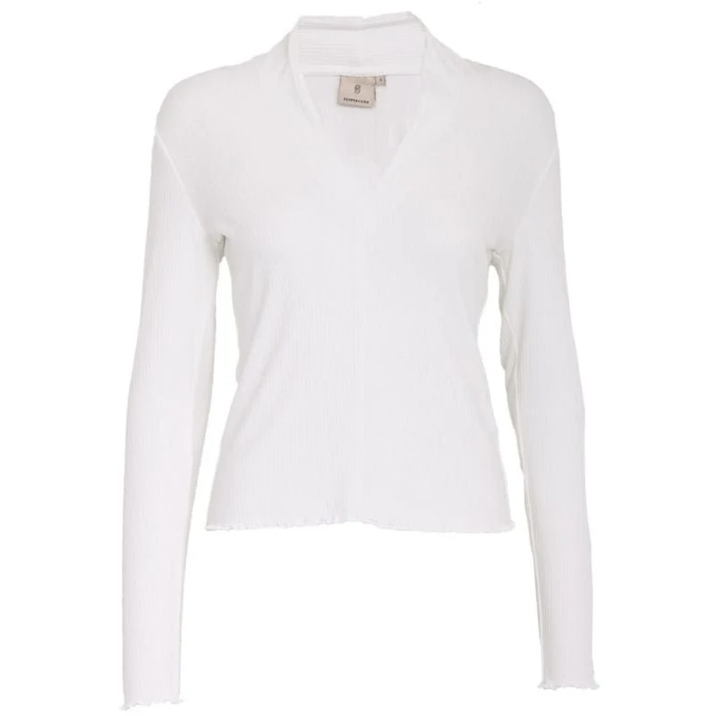 Whitecap Creme v-neck top Minna van Peppercorn voor dames. Deze elegante top in een zachte crèmekleur is een verfijnde basic die je eindeloos kunt combineren. De subtiele v-hals zorgt voor een vrouwelijke uitstraling, terwijl de aangesloten pasvorm het silhouet mooi volgt. De lichte ribstructuur geeft het ontwerp net wat extra detail zonder dat het zijn minimalistische karakter verliest.
