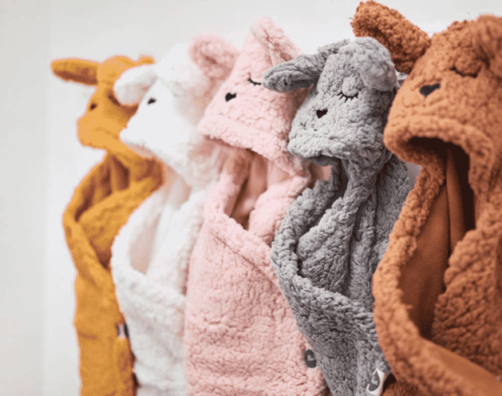 Wikkeldeken met gegarandeerd mega hoge cutenessfactor. De stof is van fluffly vachtlook aan de buitenkant en heerlijk comfortabel zacht aan de binnenkant.