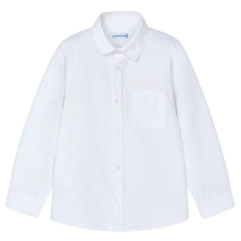 Wit basic shirt van Mayoral voor jongens. Deze blouse is voorzien van een kraag, lange mouwen en een knoopsluiting over de volledige lengte. Het borstzakje geeft het shirt een speels detail, terwijl de rechte pasvorm zorgt voor een nette look. Gemaakt van luchtig katoen, ideaal voor zowel feestelijke gelegenheden als casual dagen. Een veelzijdig item dat elke outfit een frisse uitstraling geeft.
