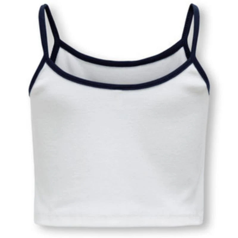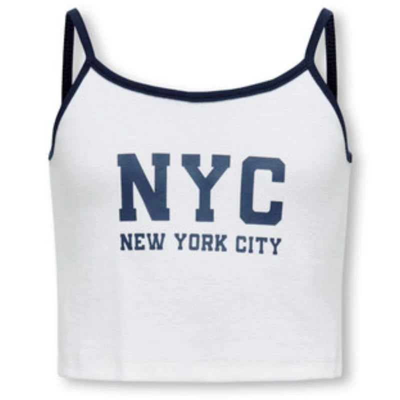 Wit met blauwe top Vikka van ONLY voor meiden. Deze sportieve crop top is voorzien van smalle bandjes en een opvallende “NYC ” print op de borst. De blauwe biezen geven het geheel een contrasterende look. Ideaal voor een casual zomerdag of een relaxte streetstyle outfit. Verkrijgbaar in het blauw en rood.