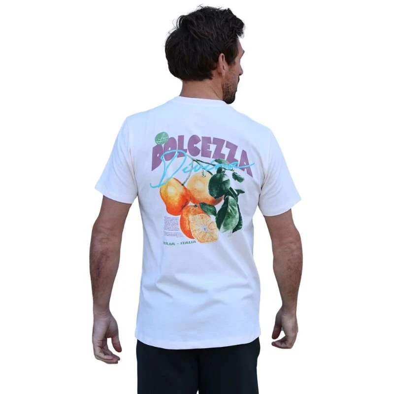 Wit t-shirt Dolcezza van Kultivate voor heren. Dit regular fit shirt is gemaakt van 100% biologisch katoen en heeft een opvallende rugprint, met een subtiele print op de linkerborst. De korte mouwen, ronde geribde hals en rechte zoom zorgen voor ultiem draagcomfort. Een stijlvolle en zomerse must-have voor een relaxte, moderne look.