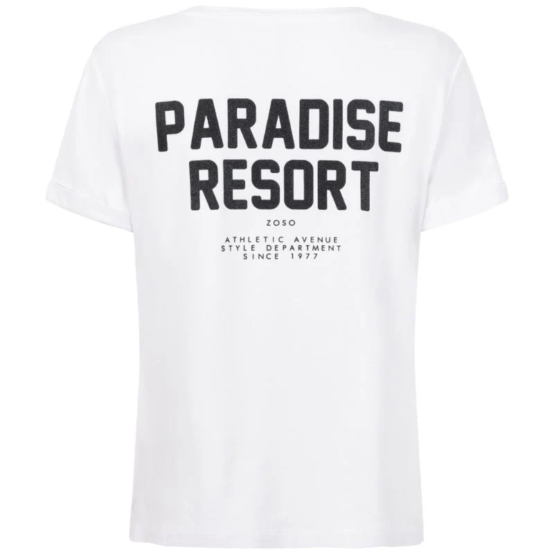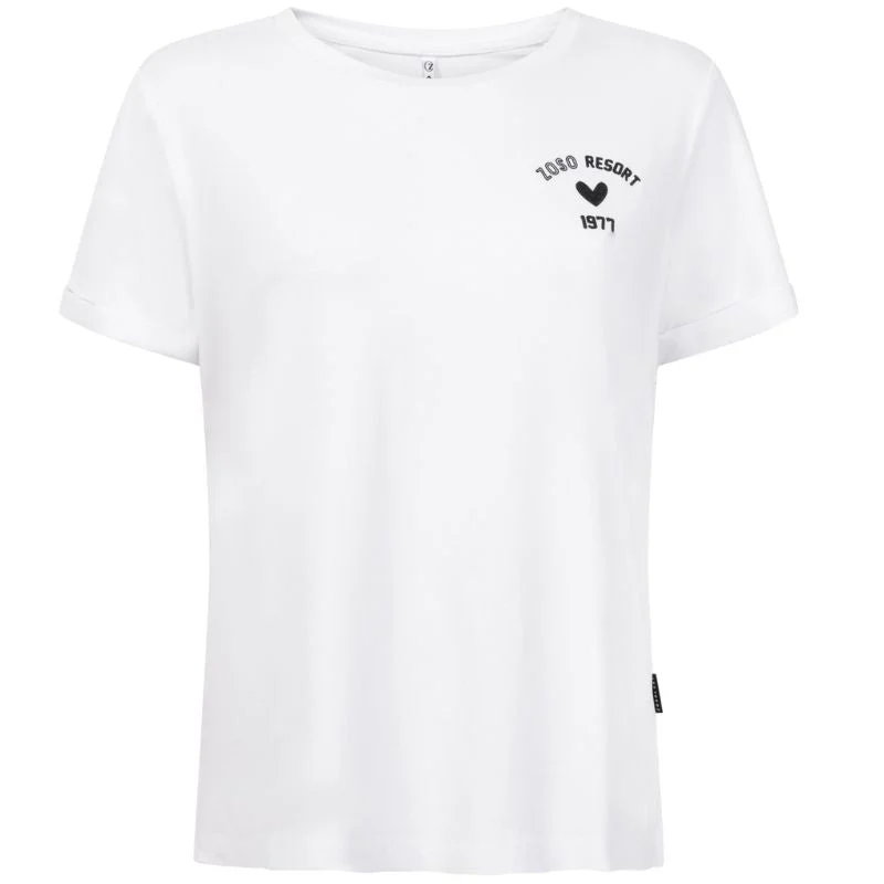 Wit t-shirt Ellen van ZOSO voor dames. Het shirt is voorzien van een ronde hals en korte mouwen, met een subtiele borstprint en backprint voor een sportieve touch. Gemaakt van 95% katoen en 5% elastaan. Een comfortabele basic die elke outfit compleet maakt en gemakkelijk te combineren is met jeans, rokken of shorts.