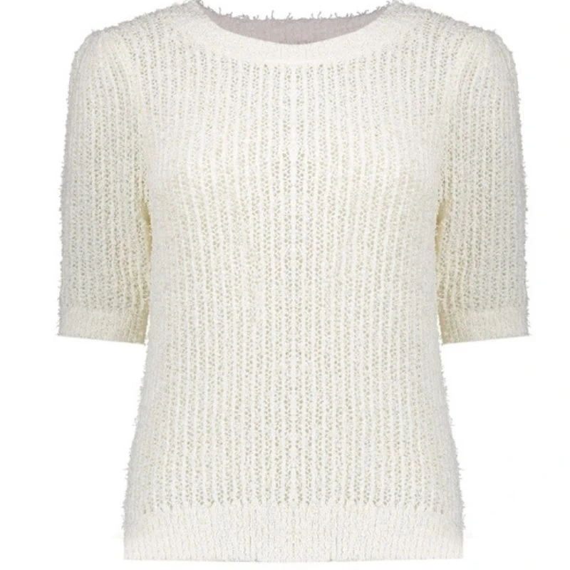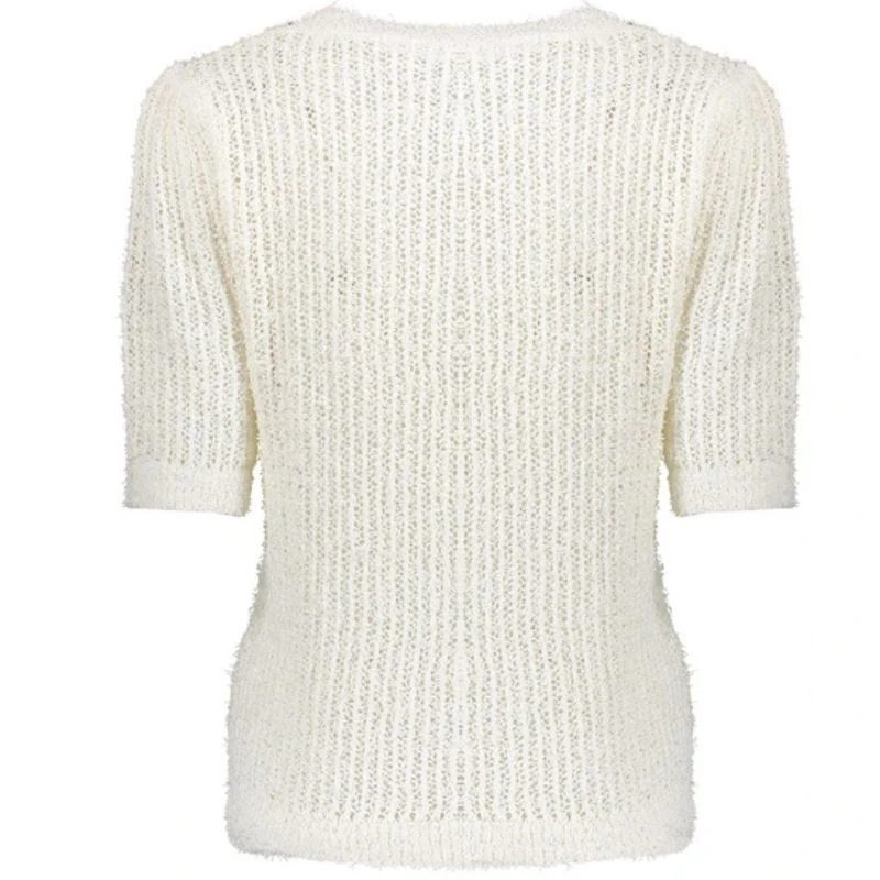 Witte pullover 54012 van Geisha voor dames. Deze stijlvolle pullover heeft een aangesloten fit en een ronde hals voor een tijdloze uitstraling. De licht geplooide korte mouwen met ribgebreide boord zorgen voor een elegante touch. Verticale opvallende naden geven een speels effect. Gemaakt van een zachte polyester-viscose mix voor ultiem draagcomfort en een luxe feel.