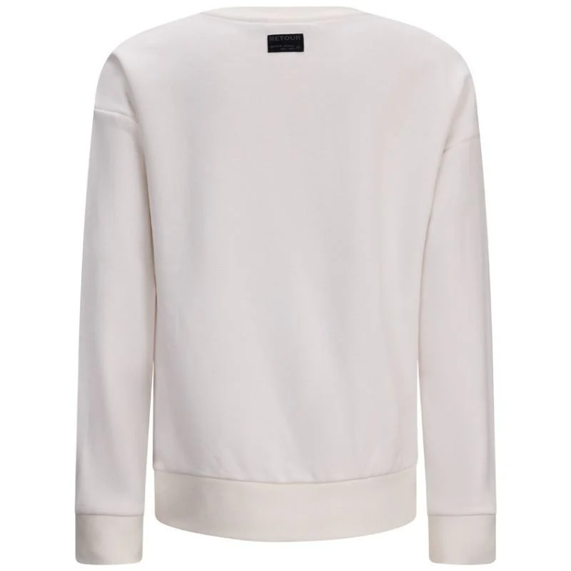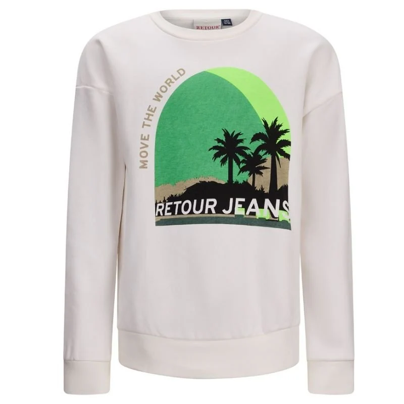 Witte sweater Ted van Retour Jeans voor jongens. Deze sweater is voorzien van een ronde hals en lange mouwen. De witte kleur wordt geaccentueerd met een gekleurde borstprint. Gemaakt van 85% katoen en 15% polyester voor een zachte ademde stof. De elastische mouwen en onderkant zorgen voor een perfecte pasvorm en extra draagcomfort.