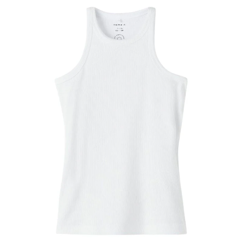 Witte top Kab van Name It voor meiden. Deze top is voorzien van een ronde hals en hemd bandjes. De top is wit met een geribbelde structuur. Gemaakt van 57% katoen, 38% modal en 5% elastan. De top heeft veel stretch en is makkelijk te combineren. Perfect voor het warme weer.