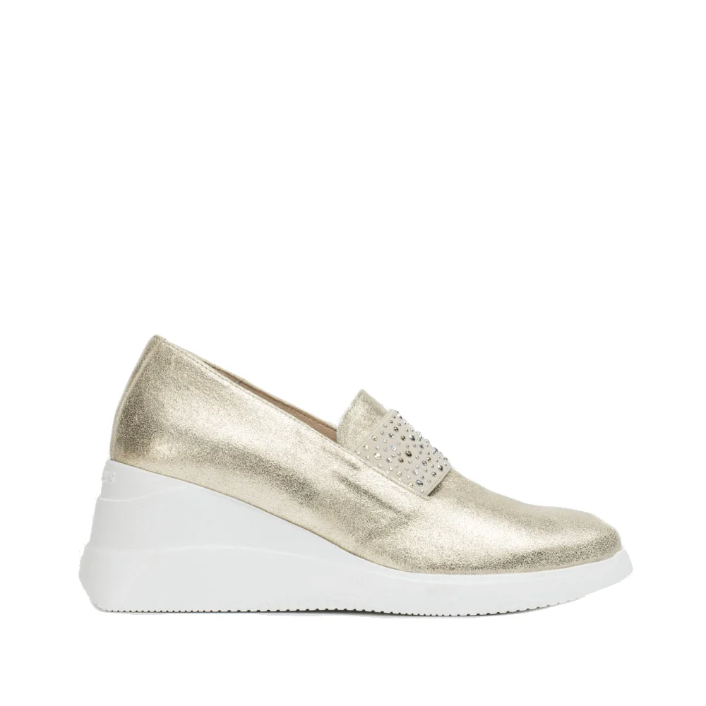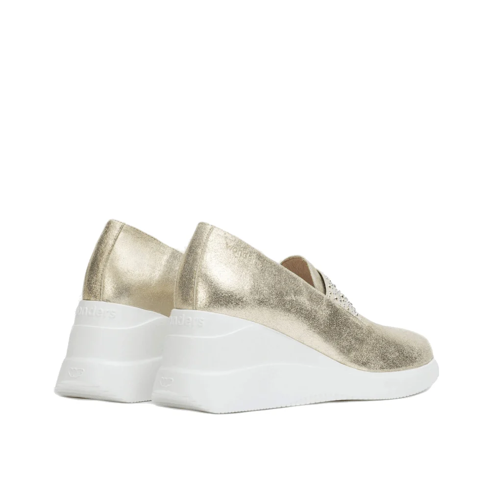 De Wonders Instappers 6605 Platina brengen een vleugje glamour naar je dagelijkse garderobe. Deze goudkleurige leren mocassins zijn niet alleen een lust voor het oog dankzij de stralende strassdetails op de wreef, maar ook een genot om te dragen. Met een stijlvolle sleehak die je silhouet verfijnt en WondersFly™ technologie voor een licht en comfortabel gevoel, beloven deze instappers een unieke loopervaring. Of je nu door de stad wandelt of een avondje uit gaat, de Wonders Instappers 6605 Platina verzekeren je van zowel comfort als stijl.