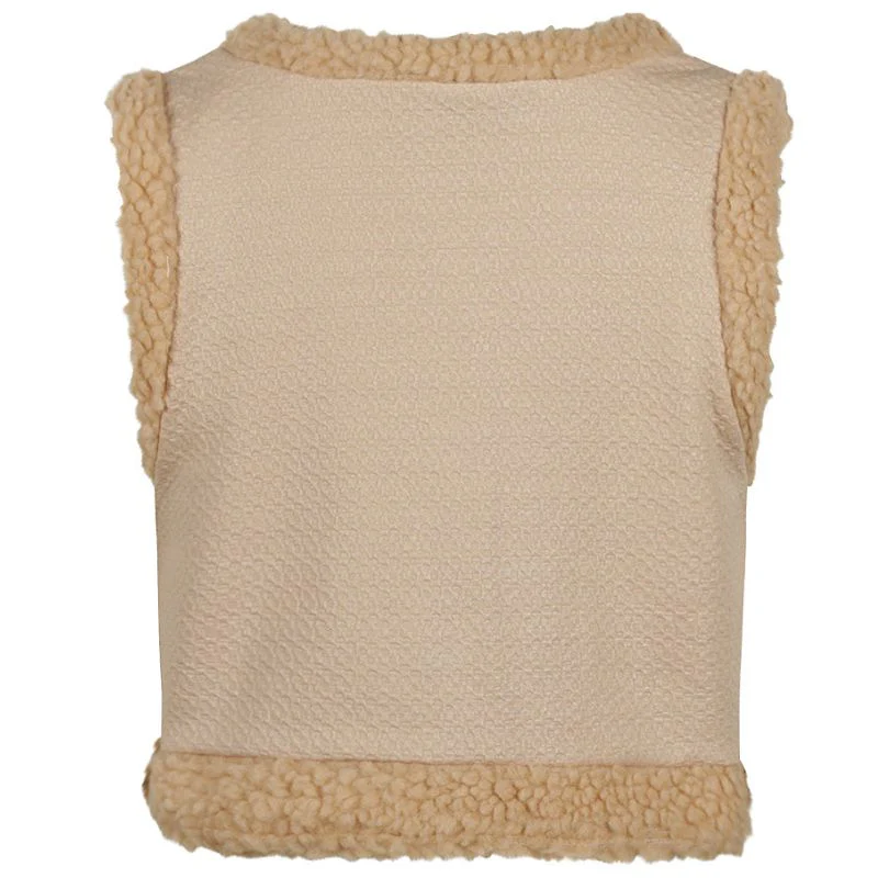 De bodywarmer is gemaakt van een mix van 80% polyester, 15% viscose en 5% elastaan, met een zachte polyester voering. Hierdoor zit het gilet lekker warm en biedt het voldoende bewegingsvrijheid voor actieve meisjes. Het teddy randje en de structuur in de stof maken dit item bijzonder en stijlvol, terwijl de neutrale zandkleur gemakkelijk te combineren is met zowel basics als opvallendere kledingstukken.