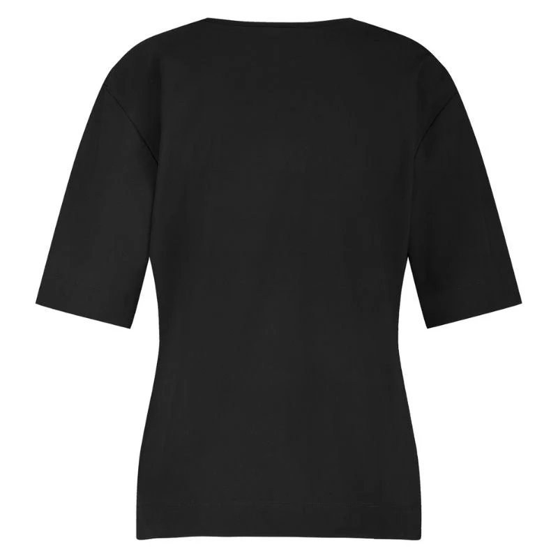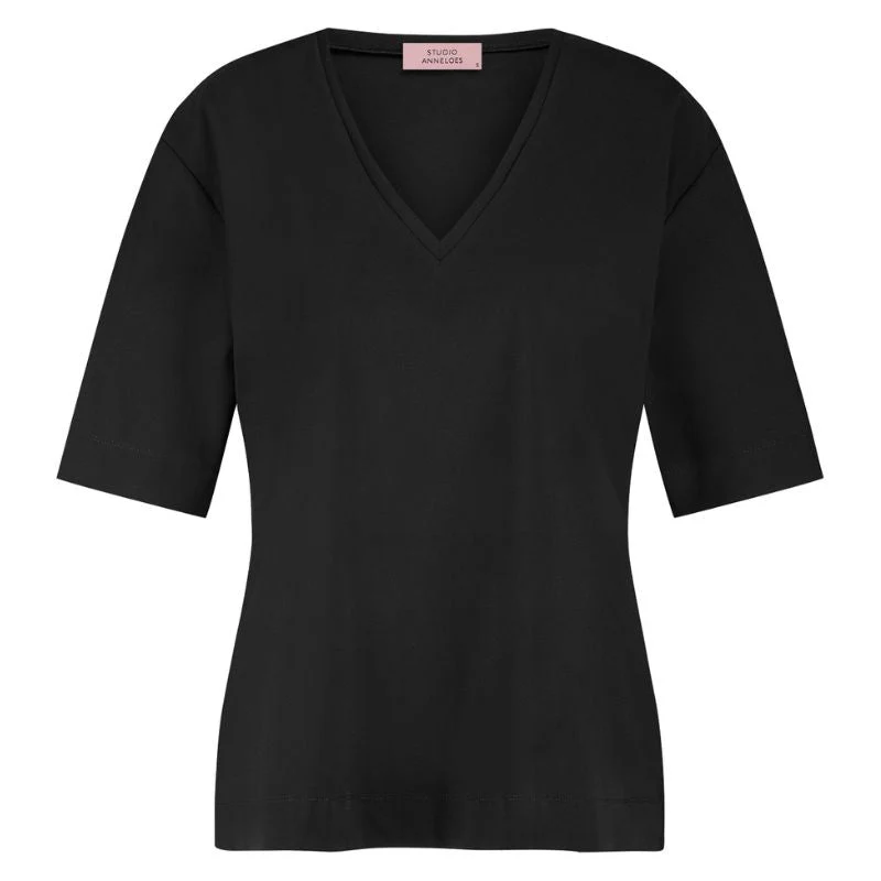 Zwart basic v-hals shirt Roller van Studio Anneloes voor dames. Het Roller shirt van Studio Anneloes is een echte essential voor iedere garderobe. Dit zwarte v-hals shirt is ontworpen als veelzijdige basic met een vrouwelijke twist. Dankzij de diepe v-hals en de korte mouwen heeft het shirt een elegante, maar ook casual uitstraling. De regular fit zorgt ervoor dat het comfortabel losjes valt en geschikt is voor elke dag.