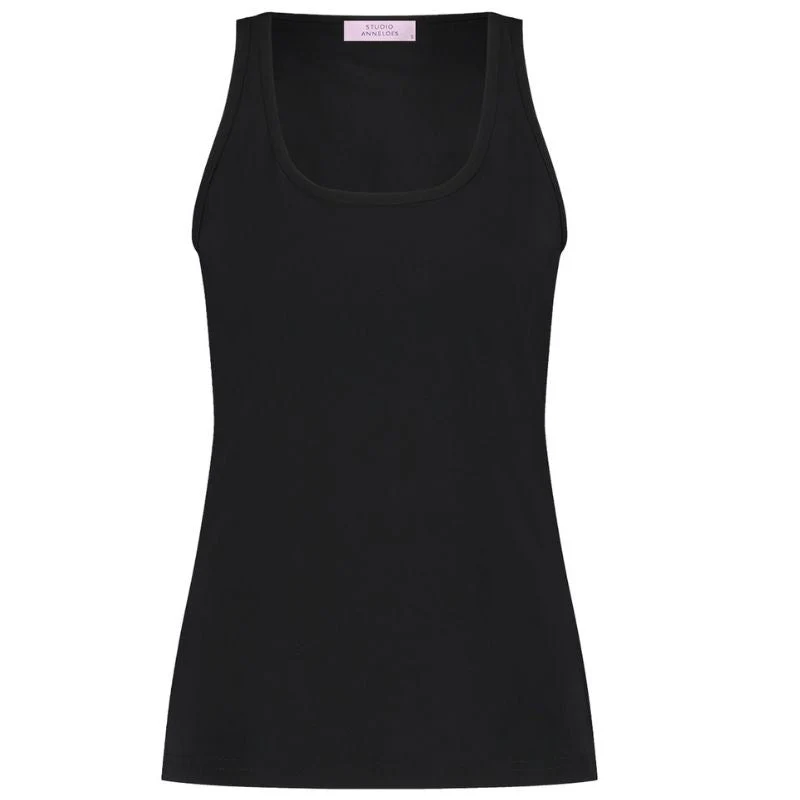 Zwarte basic travel tanktop Nova van Studio Anneloes voor dames. Deze top is een absolute essential die stijl en comfort moeiteloos combineert. Dankzij de slim fit pasvorm sluit de Nova top mooi aan op het lichaam, waardoor je figuur op een subtiele manier wordt geaccentueerd. De ronde halslijn en de nette afwerking maken deze zwarte variant een tijdloze basic die altijd van pas komt.