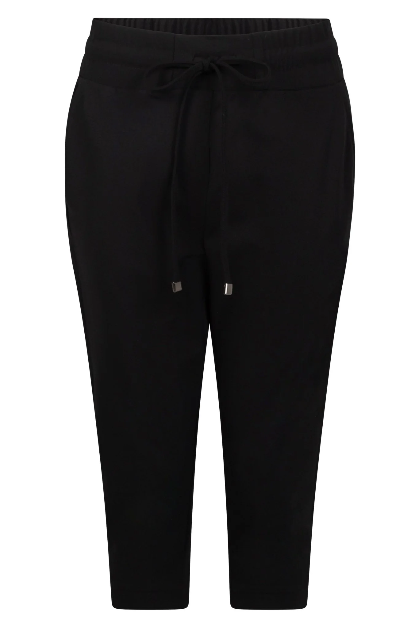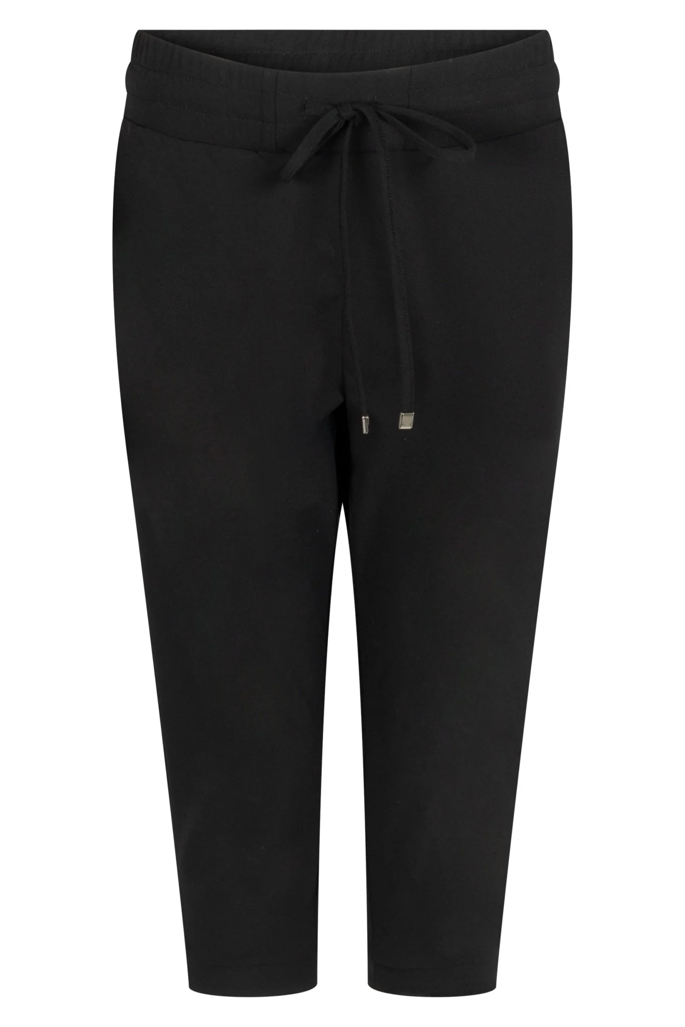 Zwarte capri Linda van ZOSO voor dames. Zwarte capri voorzien van een elastische tailleband met tunnelkoordsluiting. Voorzien van steekzakken aan de voorkant en klepzakjes aan de achterkant. Deze capri valt net onder de knie en heeft een splitje. In een heerlijke stretchy travelkwaliteit. Leuk te combineren met andere items uit de ZOSO zomercollectie.
