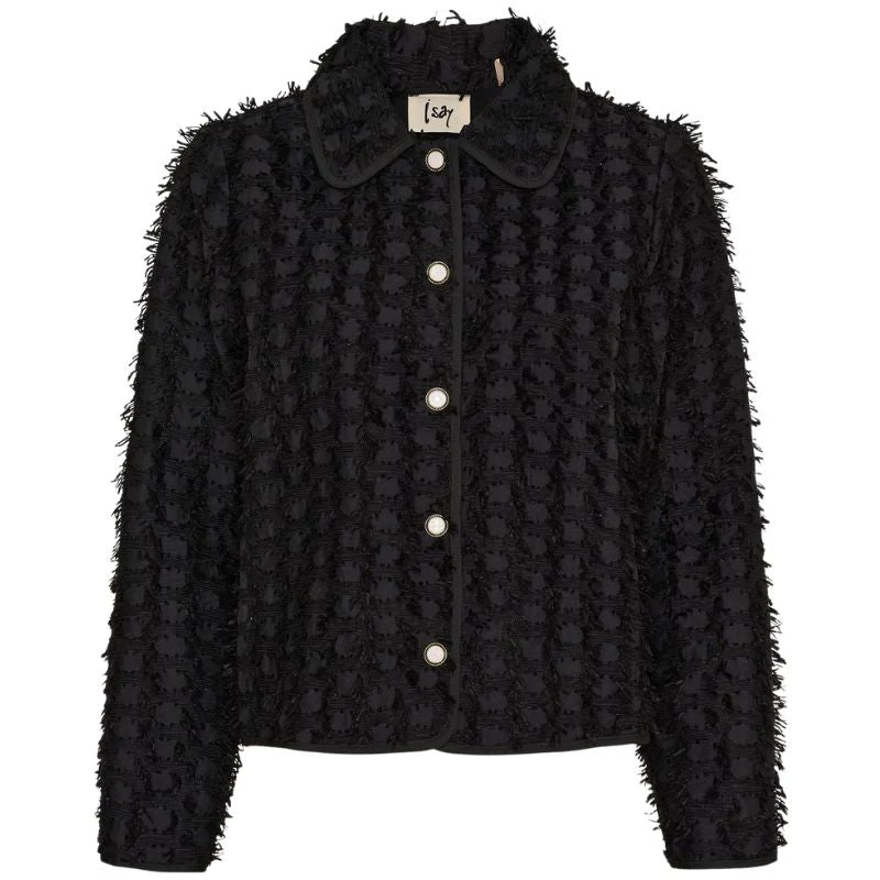Zwarte classy franje jacket Klaudia van I Say voor dames. Deze stijlvolle jas is een perfecte mix van modern design en klassieke elegantie. De korte pasvorm en de mooie overhemdkraag zorgen voor een vrouwelijke, verfijnde uitstraling die je moeiteloos kunt combineren met verschillende outfits. De subtiele franjes geven het geheel een speelse twist, terwijl de zwarte kleur het jasje tijdloos en veelzijdig maakt. Dankzij de licht gestructureerde stof voelt de Klaudia Jacket niet alleen comfortabel aan, maar ziet hij er ook luxe uit.
