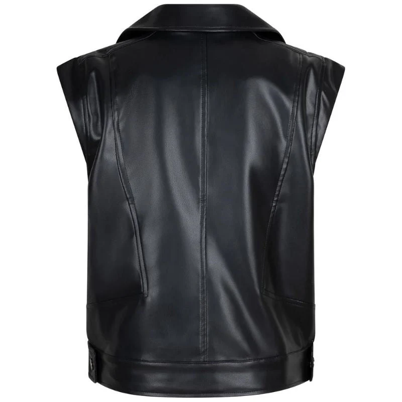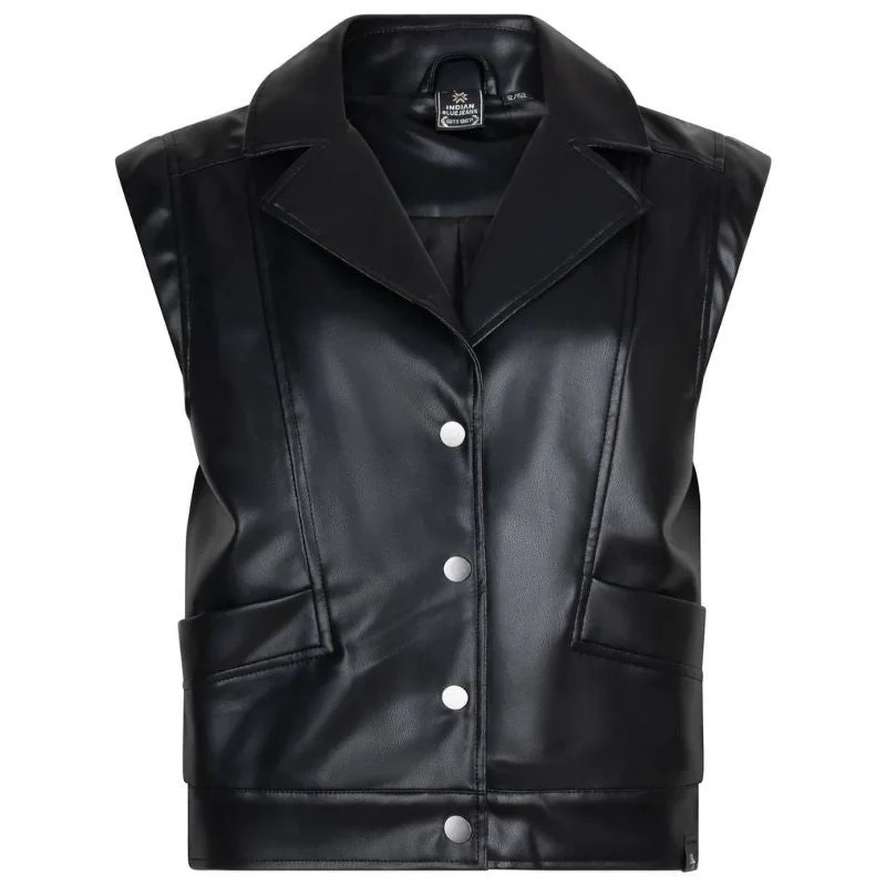 Zwarte gilet Sleeveless van Indian Blue jeans voor meiden. Dit gilet is mouwloos en voorzien van een omgeslagen kraag. Het gilet is van PU leer in het zwart met zilveren knopen. Gemaakt van 100% viscose. Het gilet heeft steekzakken en is makkelijk te combineren. Het gilet is leuk open, maar ook dicht te dragen. Een echte eyecatcher om jouw outfit af te maken!