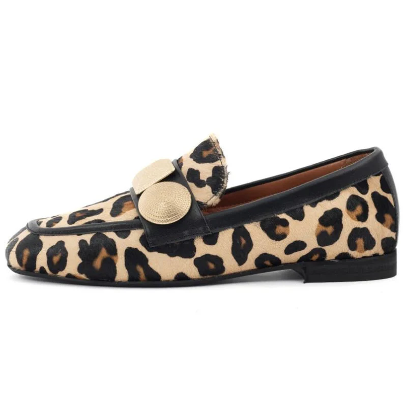 Zwarte leopard geprinte loafer Lulu van Babouche voor dames. De Lulu loafers van Babouche zijn een opvallende en gedurfde keuze voor iedere vrouw die houdt van een stoere, stijlvolle look. De levendige leopardprint in combinatie met de stoere studs zorgt voor een edgy en trendy uitstraling die direct in het oog springt. Deze luxe loafers zijn zorgvuldig afgewerkt en bieden een perfecte balans tussen fashion en comfort.
