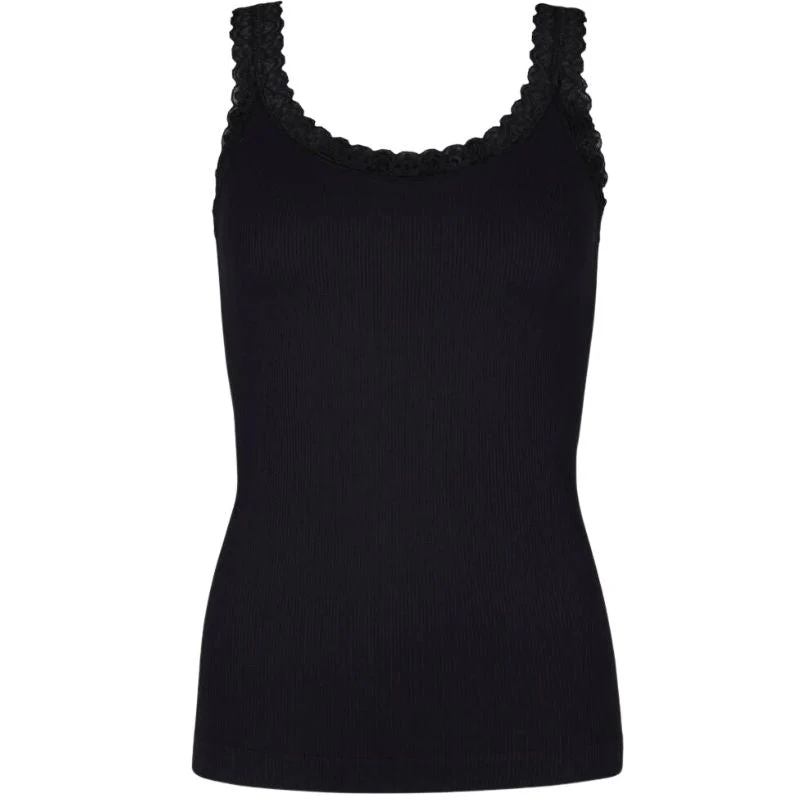 Zwarte microfiber rib top Frida van Tim & Simonsen voor dames. Deze elegante top is gemaakt van hoogwaardige microfiber met een fijne ribstructuur die zorgt voor een comfortabele en aansluitende pasvorm. De stof voelt zijdezacht aan op de huid en biedt dankzij de stretch optimale bewegingsvrijheid. De ronde halslijn is verfijnd afgewerkt met subtiel kant, wat de top een vrouwelijke en chique uitstraling geeft. De getailleerde vorm accentueert het silhouet op een natuurlijke manier en draagt prettig gedurende de hele dag.