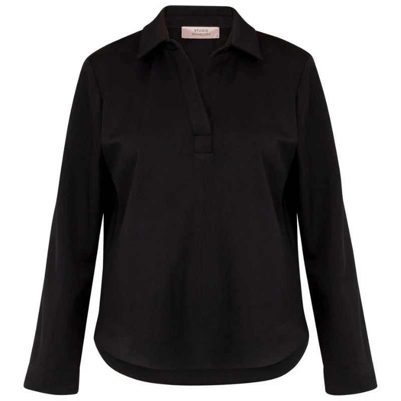Zwarte shiny bonded top Marleen van Studio Anneloes voor dames. Deze elegante top heeft een verfijnde glans die direct zorgt voor een moderne en verzorgde uitstraling. De stevige bonded travelstof voelt zacht maar vormvast aan, waardoor de top prettig draagt en mooi in model blijft. De klassieke polokraag geeft het ontwerp een tijdloze basis en maakt de Marleen geschikt voor zowel dagelijkse outfits als meer geklede momenten. De subtiele glans in de stof voegt een stijlvolle touch toe zonder te overheersen, waardoor de top ideaal is voor uiteenlopende gelegenheden.