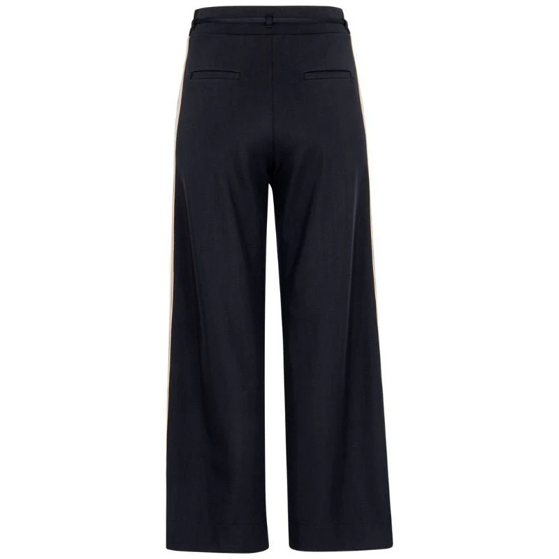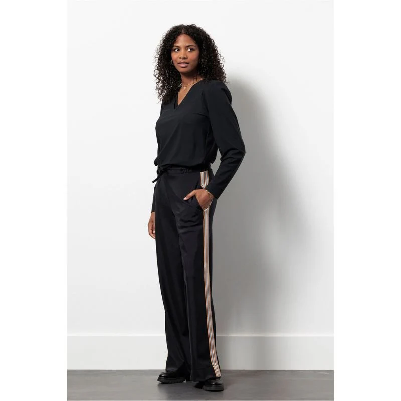Zwarte shiny bonded trousers Iggy van Studio Anneloes voor dames. Deze moderne broek is ontworpen in een shiny bonded travelkwaliteit die zorgt voor een luxe uitstraling met een subtiele glans. De stof voelt stevig en comfortabel aan en blijft mooi in vorm gedurende de dag. Dankzij de wide fit valt de broek elegant recht naar beneden en biedt hij veel bewegingsvrijheid. De zwarte kleur maakt dit model tijdloos en gemakkelijk te combineren, terwijl de glanzende finish de look een opvallend en stijlvol karakter geeft.