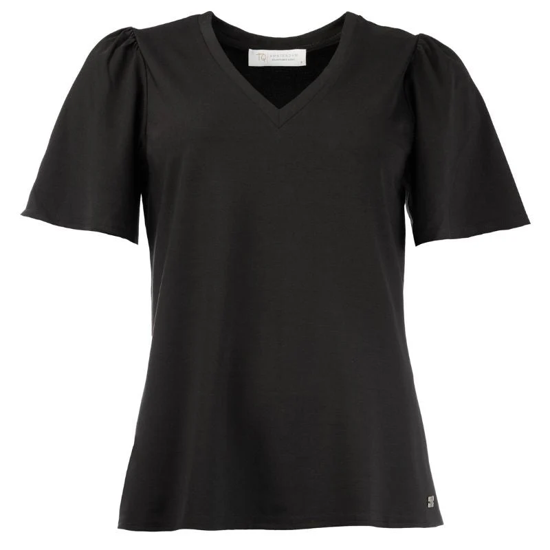 Zwarte top Relinde van TQ Amsterdam voor dames. Deze top is een stijlvolle en comfortabele keuze voor elke gelegenheid. Gemaakt van een zachte viscosemix, biedt deze top een perfecte pasvorm. De v-hals en korte mouwen geven een elegante uitstraling. Dit veelzijdige kledingstuk is eenvoudig te combineren en een must-have voor je garderobe. Verkrijgbaar in twee kleuren.