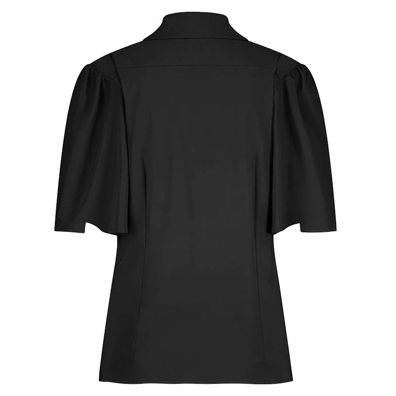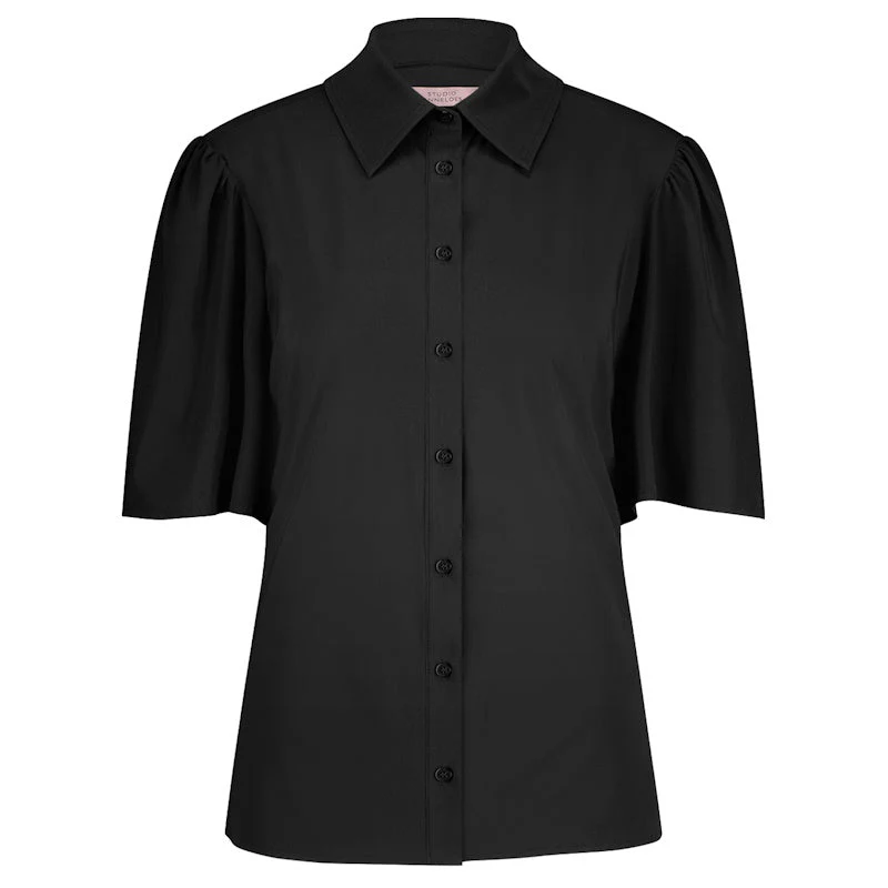Zwarte travel blouse Poppy butterfly van Studio Anneloes voor dames. Deze elegante blouse uit de Seasonal Essentials collectie is gemaakt van een luchtige en gerecyclede Light Travelstof die comfortabel draagt en mooi in vorm blijft. De klassieke kraag met knopenlijst geeft het ontwerp een tijdloze uitstraling terwijl de butterfly mouwen zorgen voor een vrouwelijke en moderne twist. Dankzij de soepele stof voelt de blouse licht aan en is zij prettig om de hele dag te dragen.